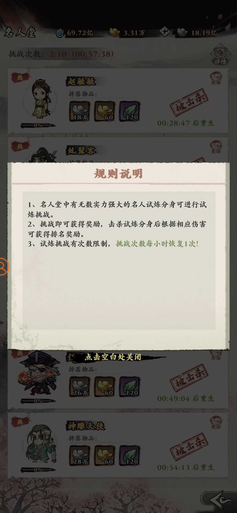 1、名人堂中有无数实力强大的名人试炼分身可进行试