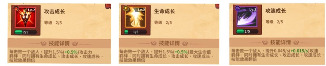 3成长系列+1个随机成长,这是必须的,最好前面就能出,尤其前期战力低的时候,不过这四个成长都是有成长极限的,不是能一直成长下去的,所以拿得晚的也不必太纠结,没必要重复开局硬刷技能。