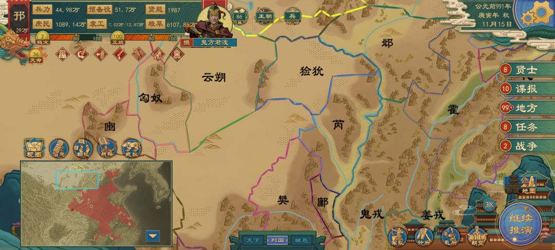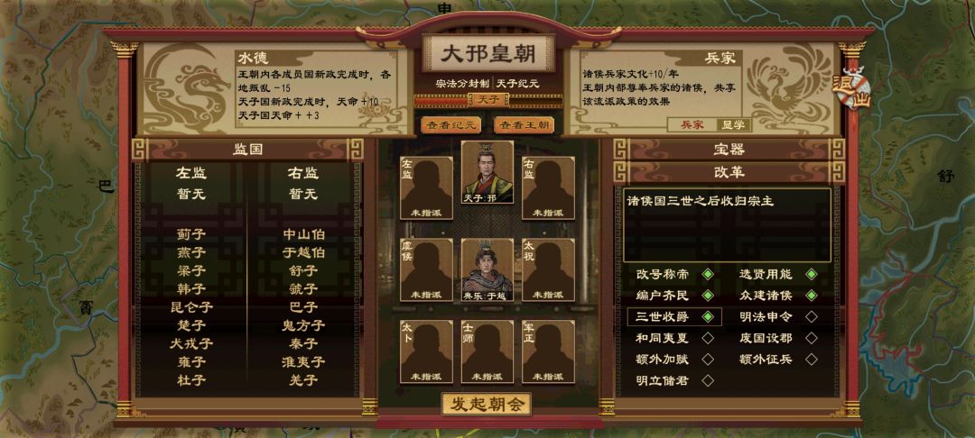 ①改革:首先你要有附属国才行,发起朝会可以提出改革,即使有人不同意也没关系强制性继续。然后看任务栏里改革完成度,快OK的时候会举行投票,在这个之前把所有附属国的降成子爵,因为子爵没有投票资格。"众建诸侯"跟"三世收爵"完成后就慢慢玩吧因为其他国家会自己裂开。比如下面的鬼方直接裂开了,再过两代直接归我。