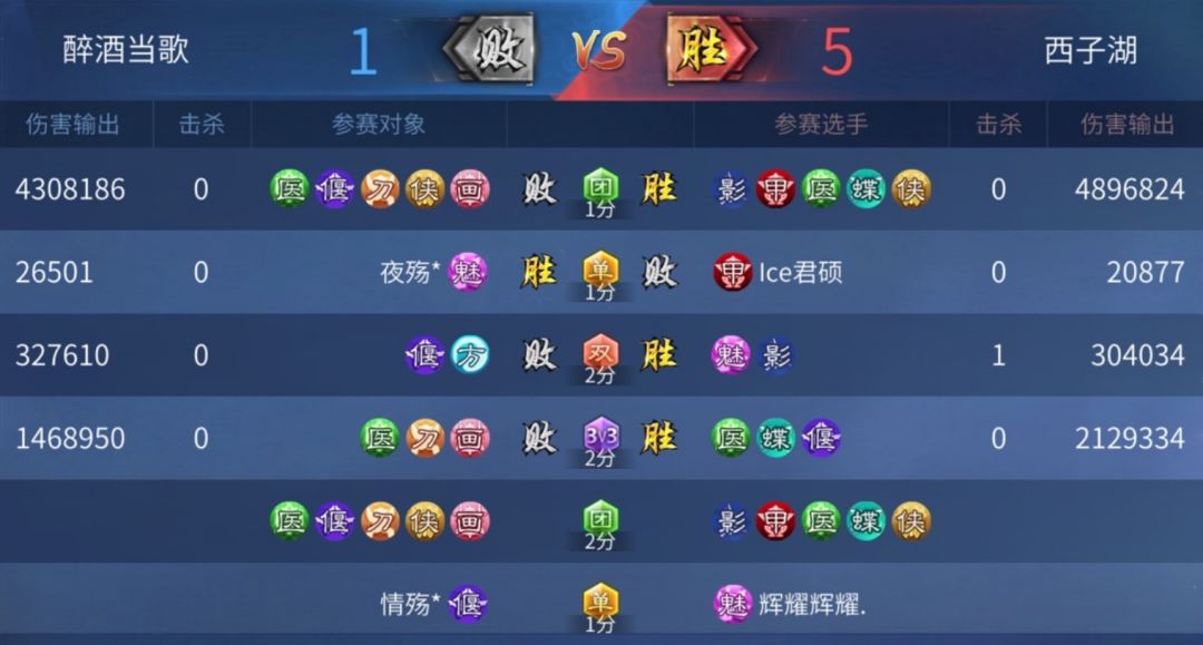在第二局的单人赛中,醉酒当歌战队的夜殇*对西子湖战队的Ice君硕进行变狐+混乱,同时开启了一波输出。在黄鹤绕碧树与青龙·灭的对决之后,醉酒当歌战队领先了伤害优势并保持至比赛结束,追平比分。