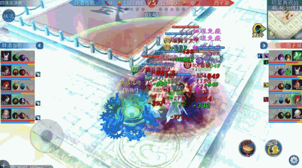 在第一局的团队赛当中,双方多次出现伤害优势的领先,其中醉酒当歌战队在比赛进行到1分7秒时将领先优势扩到最大,伤害数领先18w左右。