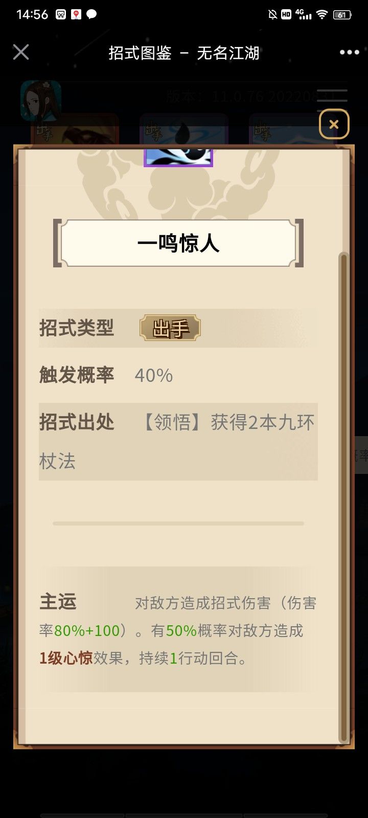 其他的也是同样的道理,比如说霸王卸甲要对手处于破绽状态下才可以暴击你在前面放个打破绽的武功或者招式不就可以了。