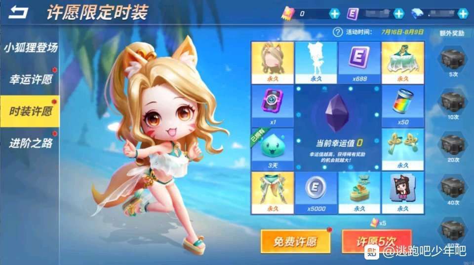 给大家一个获得夏日时装的攻略 限定磁水枪 炫光等 首先图1 第一皮肤不用说了 新人物传说皮肤 钻石抽才能抽到 预计300多块钱可以获得 第二个 18块钱可以获得 第三个 冰淇凌针 周年充值返利 328块钱 第四个如果我看的没错应该是最新赛季宝藏 20级可以获得的和服 第5个 应该马上返场了没有的可以入手 应该很便宜 第6个转盘抽奖 泡沫之夏 第7个 也是转盘抽奖 冲浪达人 第8个是转盘抽奖 时尚潜水 女警的 开始我们的攻略 首先我们看公告的时间 第一件事情我们要做的的是 购买宝藏卡 升级到20级获得图3的皮肤 也就是图1里面的第四个需要的皮肤 第2步我们在要做的是投票 怎么投票呢 我来告诉大家 首先我们要给图1最后三个夏日限定皮肤投票 这样我们的转盘才会返场 这样图1里面的 6 7 8我们没有的才可以有机会获得 我们第三步该回到图二的 抽奖了 首先我们要等到7月31号的充值返利 等充值返利我们把图1里面的第三个冰淇凌得到之后 回来直接抽新人物的传说皮肤 如图二 这样我们就可以省了一个328 要告诉大家的是投票皮肤一定要投三个夏日的 因为其他的还会返场 这次的夏日不投的话 就不会返场了 这样 有点卷的可以等转盘抽奖兑换三个皮肤 冲一个328 充值返利 在回头抽新人物皮肤 基本炫光稳定得到~