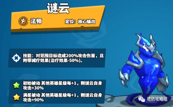 技能:对目标范围发动技能造成200%的攻击伤害,而且则附带对目标的治疗进行减疗50%效果。初始被动光环:其队友英雄星级每提升一星,则英雄谜云自身攻击加30%效果。满级被动:其队友英雄星级每提升一星,则谜云自身攻击增加90%的攻击伤害。【升级效果】