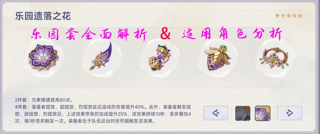 即将到来的3.3版本,须弥将开启第二个圣遗物本。全新圣遗物套装沙上楼阁史话和乐园遗落之花即可在该副本中获得。其中楼阁套为散兵专属圣遗物,不多做分析。乐园套对绽放伤害反应有较大提升,又被称为“绽放套”,对于打绽放反应的角色或许是一个选择,具体提升情况接下来会一一分析。