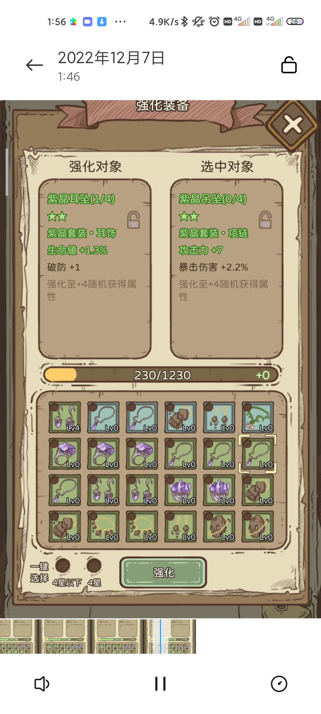 首先这个耳坠强化吃了一点经验但没有强化到1级,生命值从有数值1.3变成0(图二可看见有经验条,其他装备也尝试过都是变0)