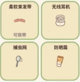柔软束发带—轻柔触感,不损伤皮肤,获得后可以得到20颗星,需要从扭蛋机里获取、无线耳机—另外一支耳机到底跑哪里去了!!获得后可以得到10颗星,需要从扭蛋机里获取、捕虫网—捕到的昆虫最后要记得放回森林哦!获得后可以得到10颗星,需要从许愿池里获取、防晒霜—注意防晒可以保护皮肤!获得后可以得到12颗星,需要从许愿池里获取。