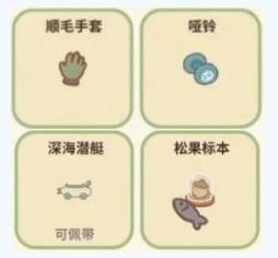 顺毛手套——不知道在哪里捡到的,是大猫猫的最爱!获得后可以得到30颗星,需要从扭蛋机里获取、哑铃—一起来健身吧!获得后可以得到25颗星,需要从许愿池里获取、深海潜艇—上天入地无所不能,获得后可以得到55颗星,需要从招牌商店里购买、松果标本—这是今年最大的松果,十分有收藏意义,获得后可以得到18颗星,需要从扭蛋机里获取。