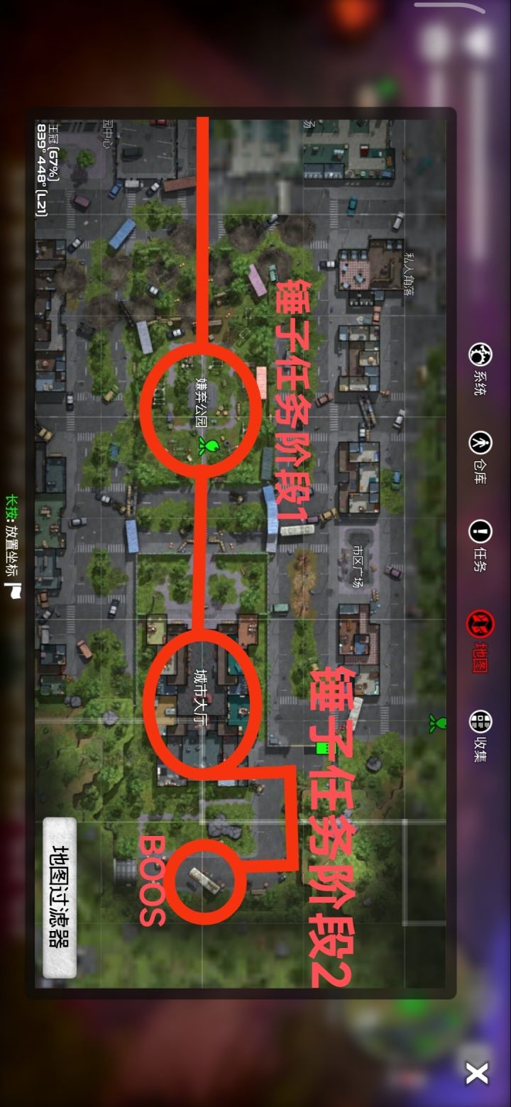 获得防毒面具后,从峡谷区最左侧布满毒气的桥上,进入到中枢城区,你会接到两个任务,火车任务是主线我就不做过多解释,锤子任务,从我划的路线走,进入先驱公园(小心公园四周机枪塔,不要从外围绕,你绕不进去),在进入城市大厅,最后从城市大厅出来走到客车位置处,这里需要你击杀俩个BOOS,这两个BOOS可以近战,但需要你解决掉其中一个才可以打近战,两种方法,非常简单,第一种先直接用手雷灌死小潜伏者,剩下一个大潜伏者跟他拼刀,第二种你地雷多的话就提前布置好地雷把怪往上引,有条件的提前布置机枪塔也可以,打掉这两个BOOS后会获得锤子蓝图