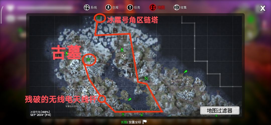 图六:很多小伙伴不知道这个古墓怎么上去,很简单,按照我所划的路线走,传送到冰霜号角区链塔处,绕路找到无线电天线杆,踩着天线杆上山就可以见到这座古墓
