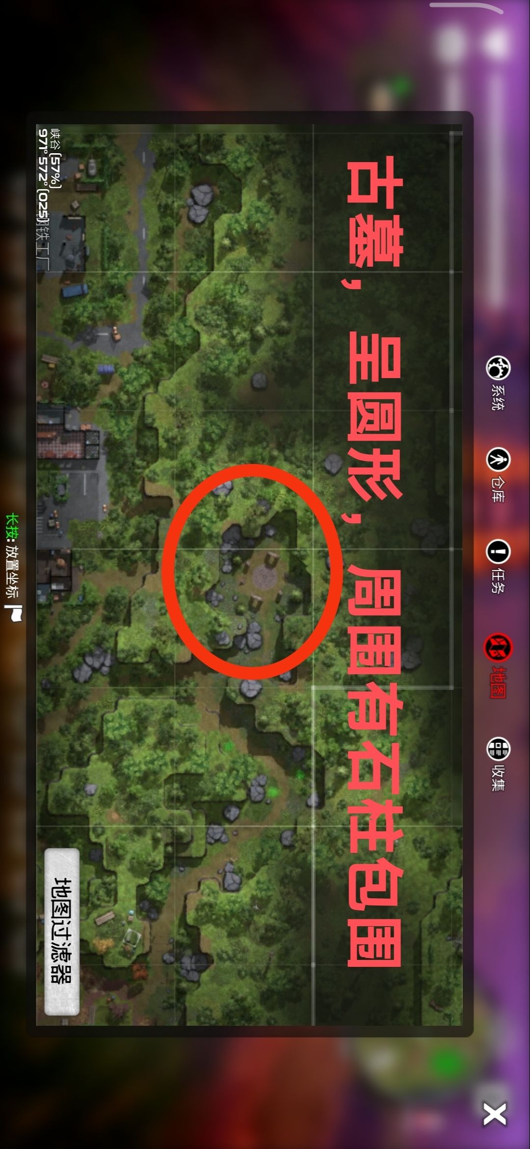 图七:古墓,内围都是呈圆形,外围石柱呈四方形或者圆形石柱阵包围,找不到古墓具体位置的,可以看图一古墓的大概位置,然后把自己的游戏里的地图放到最大,在大概位置找这种样式的地形,那就是古墓。