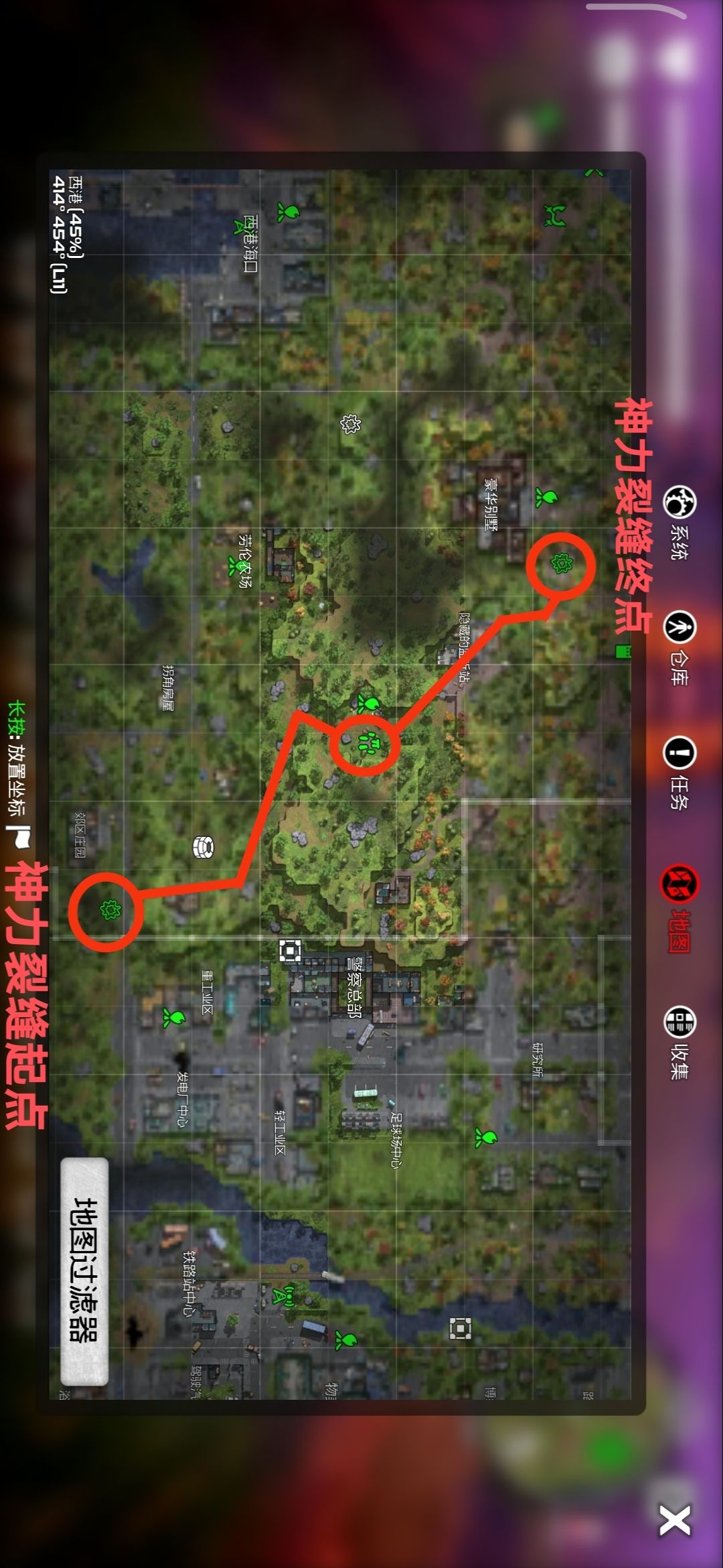 图四:获取裂谷工具包后,就会在地图上看到所有神力裂缝坐标并允许进入,在中枢城区重工业区与西港区郊区庄园交汇处,消耗三枚神力块进入,这里有一个墓,完成后再从终点传送回地面
