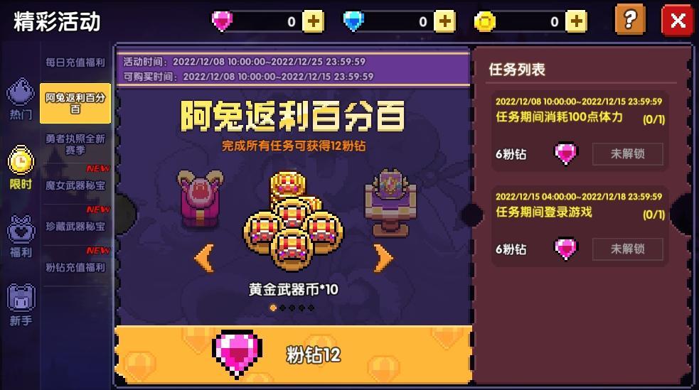 勇者们的全新精彩活动!在可购买时间内购买礼包并在规定时间内完成相应任务,即可获得总价值与对应购买花费数额相当的返利~