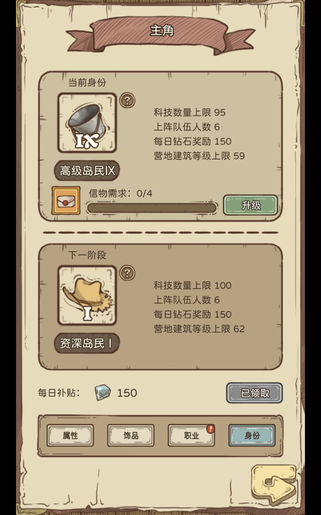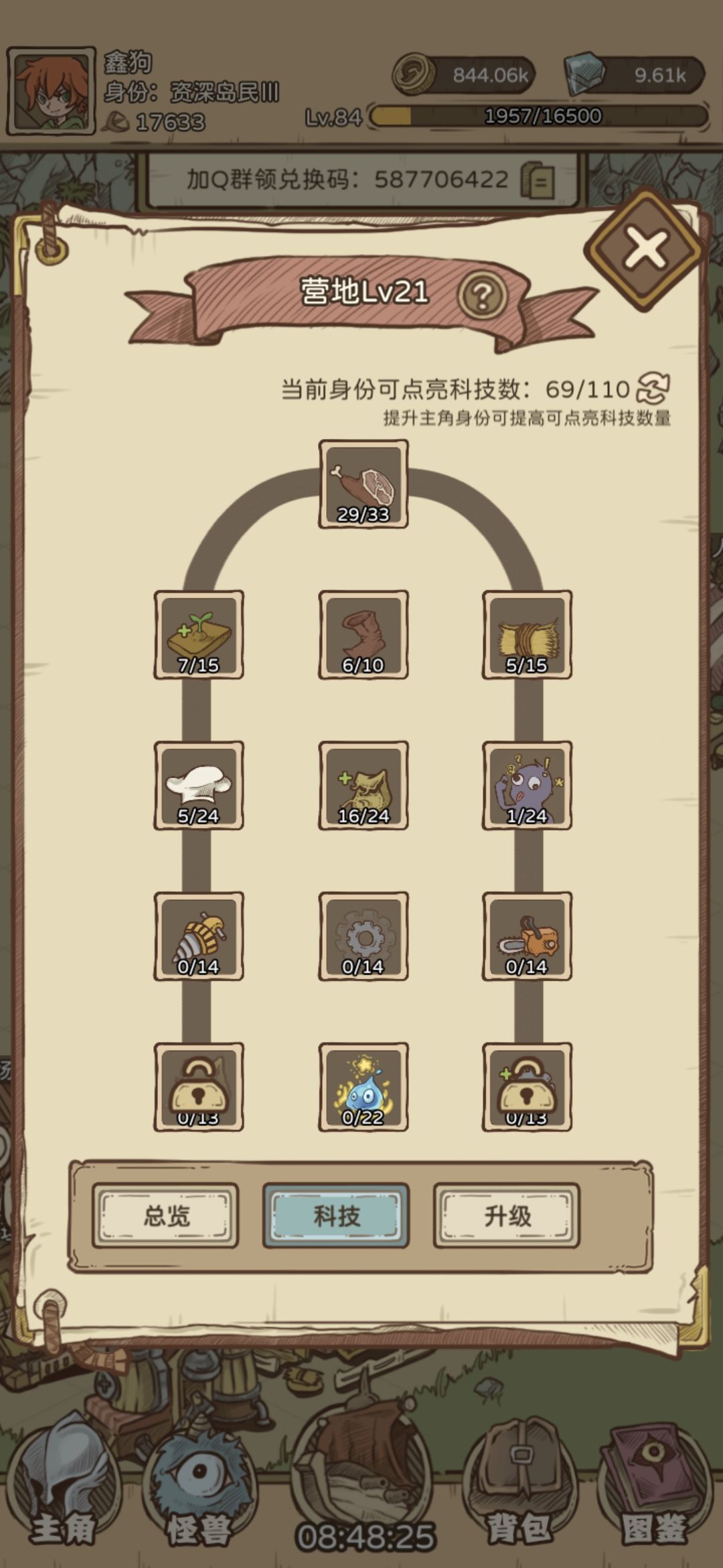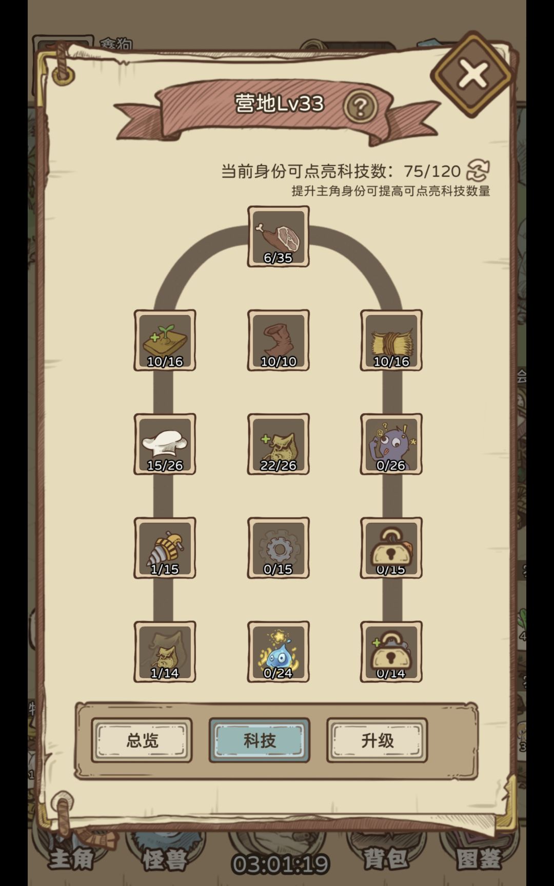 游戏内的主要设施之一,营地等级决定了看广告给的金币收益以及农田及其他设施的最大等级,科技优先选择口粮上限(提升跑图推图上限),其次是负载回复(增加商人公会每分钟回复的可售卖物品数量),其他的按照个人需求点即可,前期营地优先升到十一级,因为会送你两个生产建筑上限(每十级赠送两个位置),后续直接十一级拉到二十一级