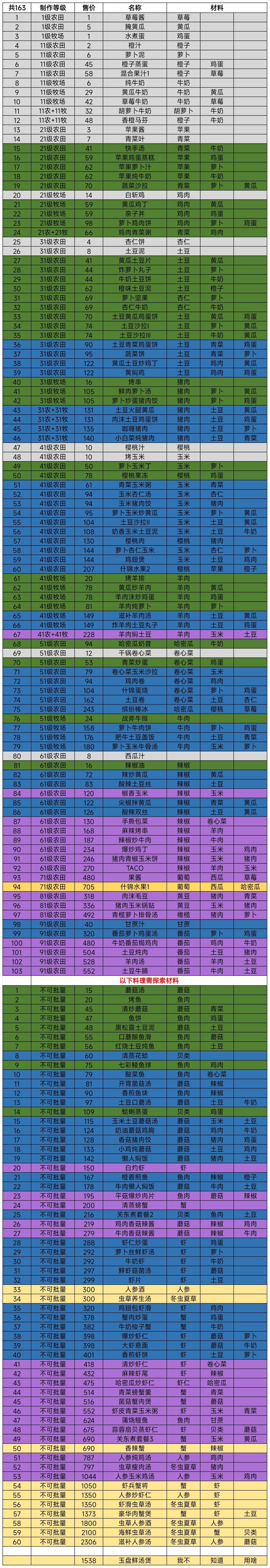 31级成型后个人推荐:2鸡蛋,4鸡腿组成6牧场;2土豆,2黄瓜,组成4田地,每小时根据商店价格最高的黄瓜土豆炒鸡丁和黄焖鸡决定制作什么食物,每小时量产7200+,出售获得1.2m+(直接拉41级营地,到了41级营地再拉41级牧场)
