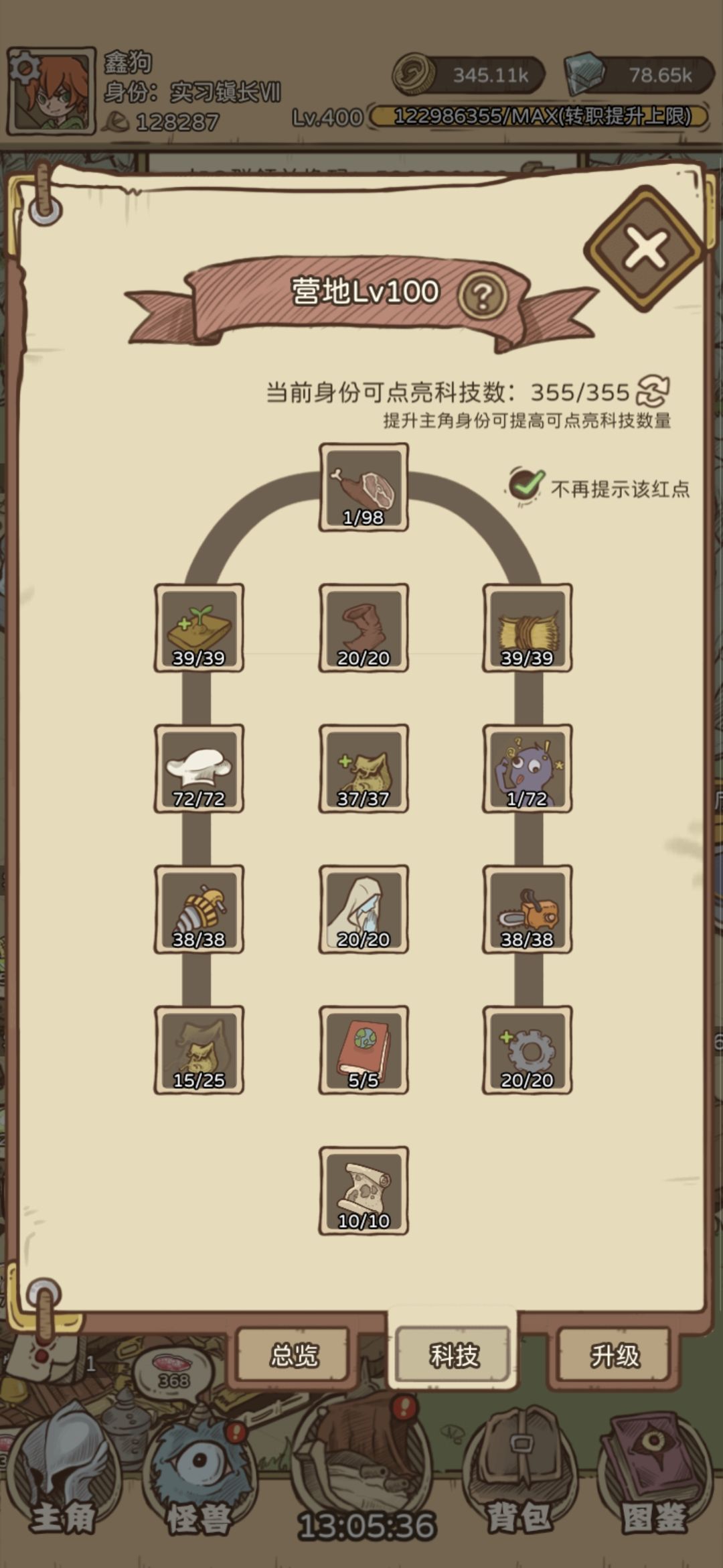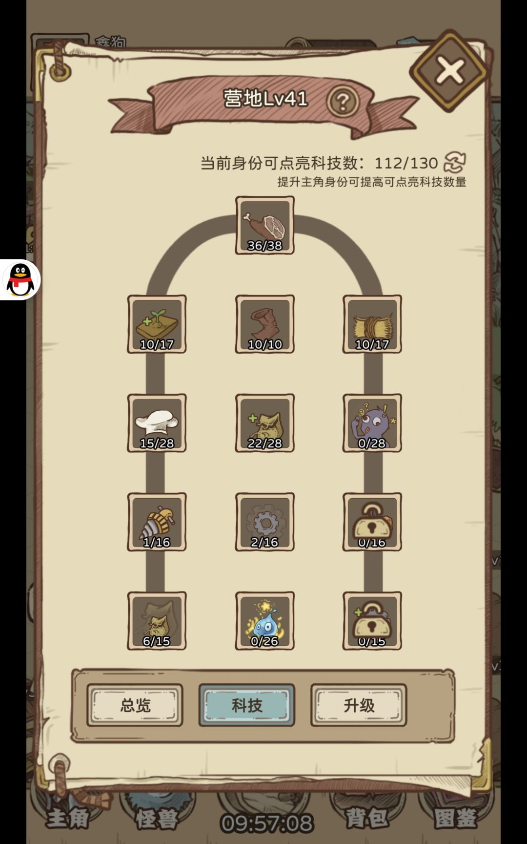 当口粮达到675k跑全图10小时30分钟或者645k 10%科技移速的时候跑图9小时32分钟50秒时就可以跑完图八全图了,图九很大概率会卡图,目前只有战士能少量打过,这个时候就可以选择将科技洗点(如下图)多出来的钱拿去升级31级营地来发育经济,跑图就跑前三个BOSS,自己的基础口粮是足够的。(负载回复点到120每分钟也就是22级,田地和牧场加成点到10%,料理销售提升到15%,移动速度点到10%,其余的可按照自己洗好点)