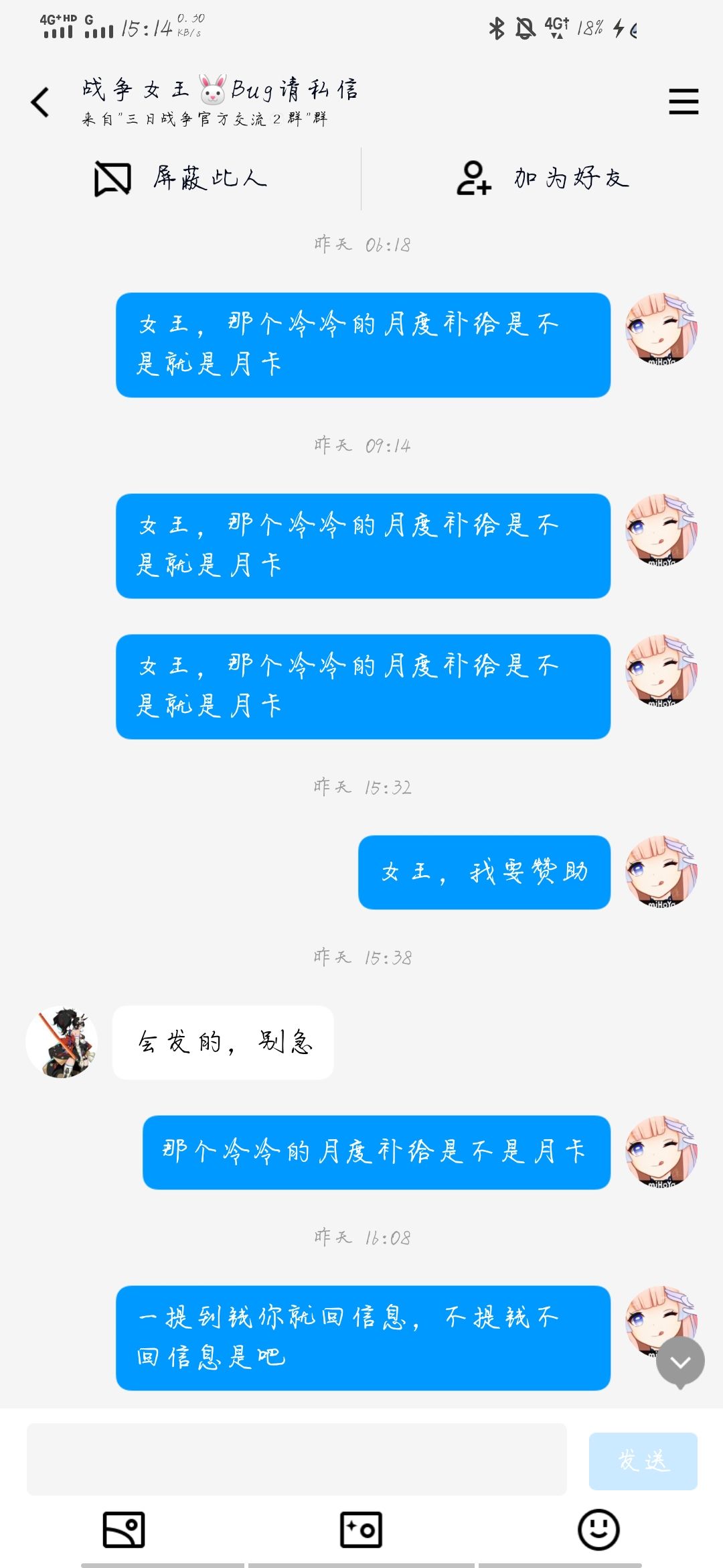 具体原因就是图内所写,并且女王以非常忙为借口从其他图可以看出,女王不仅不回答问题并且把我当作急需月卡的猴来看,我一个问题问了一天,他只说“会给的,别急”如果深度解读就是,着什么急,我正为了国际服忙着呢,你这种小问题我回答不回答都没关系,我不回你也得受着,可能我解读的有些许错误,也有可能真的很忙,但我就像问,你有时间回答我你为什么不回我的原因而不是回答我问了一天的问题,真的,你如果真的没空看私信你完全可以弄一个专门读取私信的人员,你又要做游戏又要读私信肯定是忙不过来的,就这样吧,主要原因还是昨天女王的工作失误导致我被迫和一个无辜的人骂,虽然我在这里说女王可能看不到,但我还是得说,那些因为你的工作失误破坏了游戏体验的玩家你确定不给点补偿?或者说明原因?如果我不问女王可能这个失误的事情会被瞒着很久,行了,就这样吧
