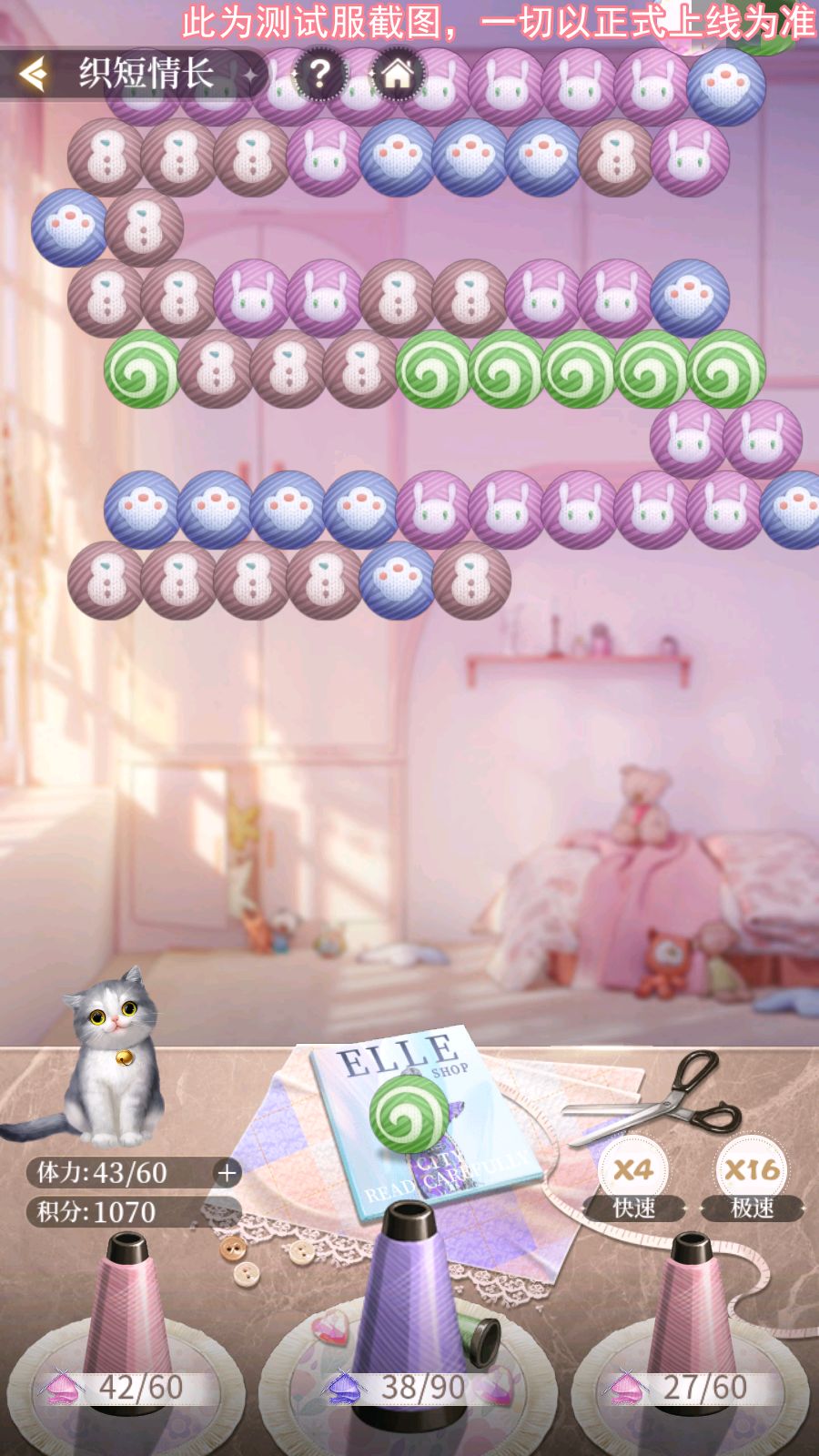 三小姐可以朝界面上方发射线团,击中2个及以上同类且相邻的线团,线团即可下落。线团会随机落入三个线圈中的其中一个,并获得积分,积分可用于在兑换商店中兑换道具奖励。每个线圈集满之后,可获得樱粉织针或紫藤织针。