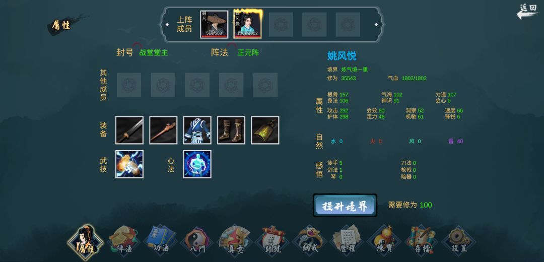 这款游戏里“npc的境界实力随着主角的境界变化而变化”很多萌新玩家一上手就无脑升境界[包括楼主],结果化神境界连练气境的小怪都打不过,究其根本便是境界上去了,实力没有上去,因此,谁都打不赢,那么怎么才能提升实力呢?个人认为提升最快的途径就是升级心法的同时却不升级境界,即一直卡在某一境界,例如楼主,目前故意卡在练气一重,却把心法升满级了,数值爆炸的强,面板堪比归虚强者