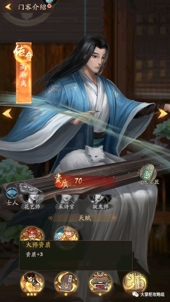 一代宗匠高渐离,一代宗匠的门客都是传奇门客,传奇门客都是大师资质,大师资质都是3星的,卓越门客都是2星的非凡资质,优秀和普通的门客都是普通资质一星。3星的资质升级获得的赚速会更高,因为基础属性都是+3的后面用后面用资质丹进行升级星级虽然不会变但是资质会加,也可以用市井百业书籍经验升级。
