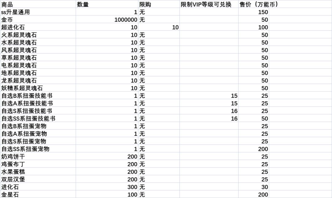 万能币可兑换商品列表,不支持拆分出售,如:经验药水100个=10个币,不支持1个币兑换10个,限购商品不支持无限兑换,每周每人支持一次,同一个号/同IP都将视为同一人