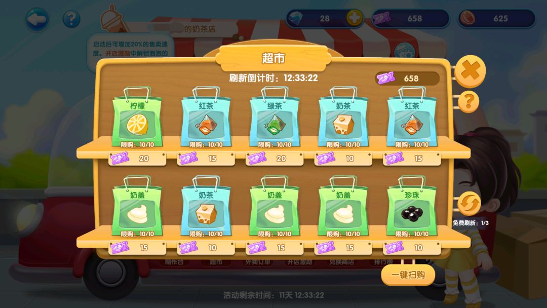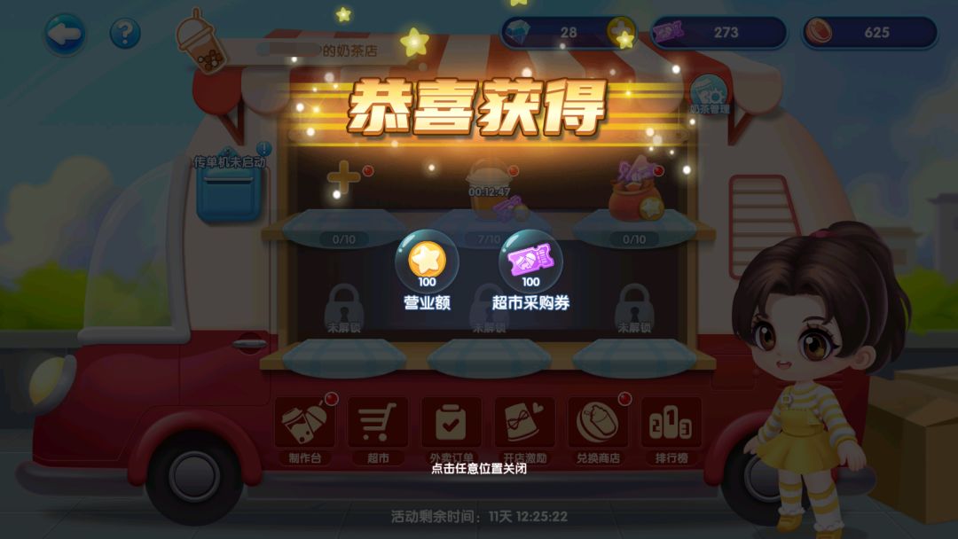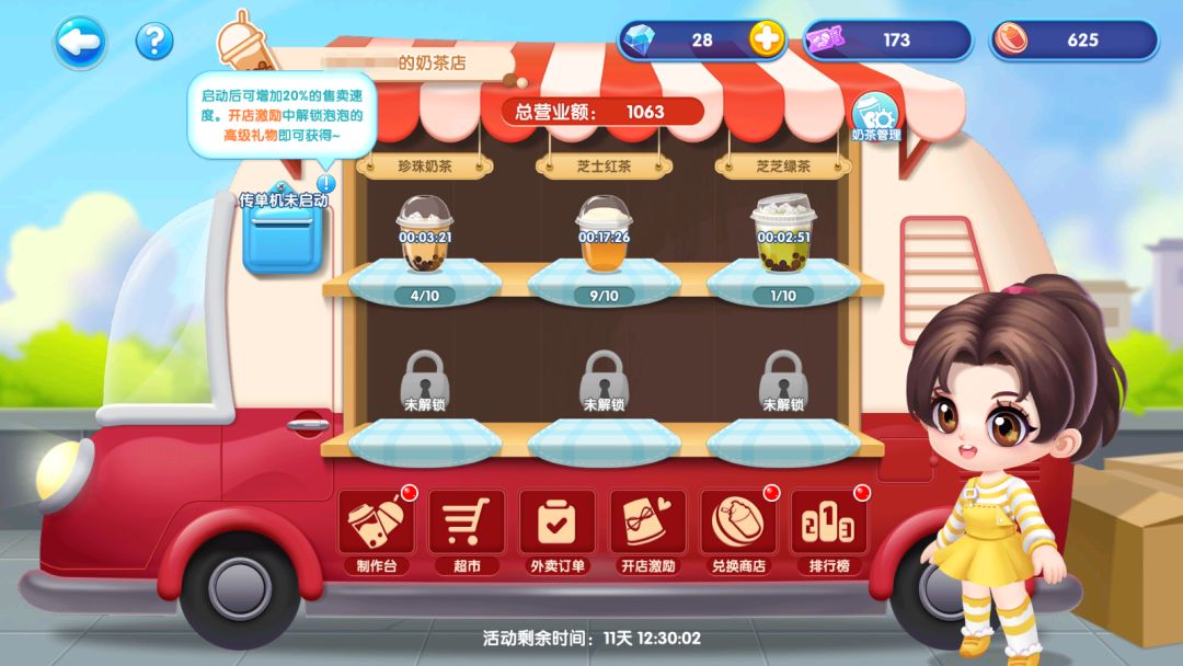 解锁高级礼物即可开通传单机,更有超市采购券x3000直接到手,另外所有奶茶售卖速度将增加20%!