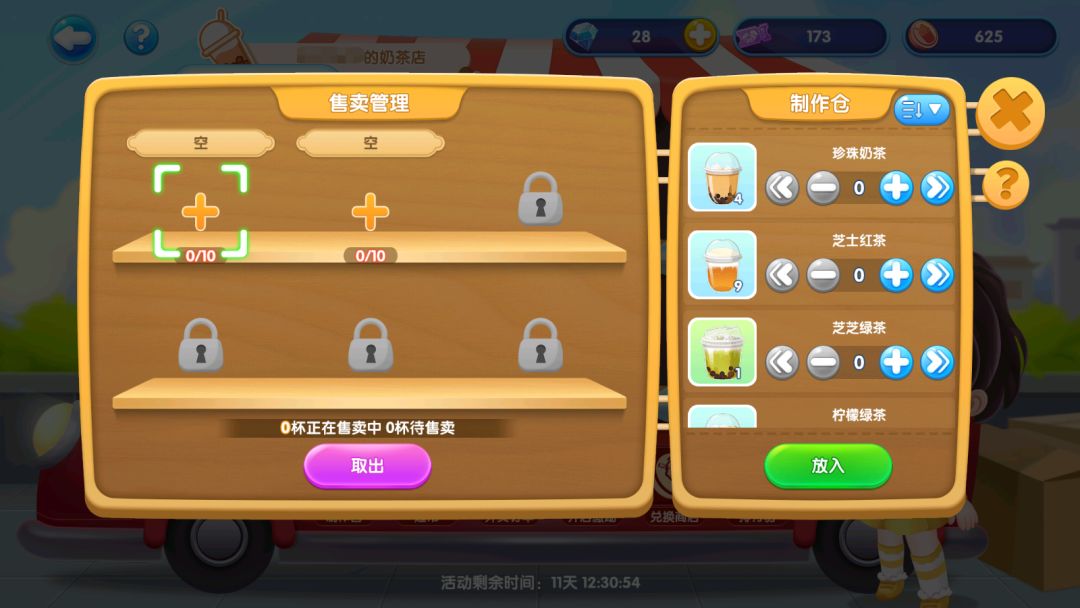 完成订单后,再将制作完成的奶茶放入售卖位,每个售卖位可以放10杯同种类奶茶,定个小目标,解锁多款奶茶将小店做大做强吧!