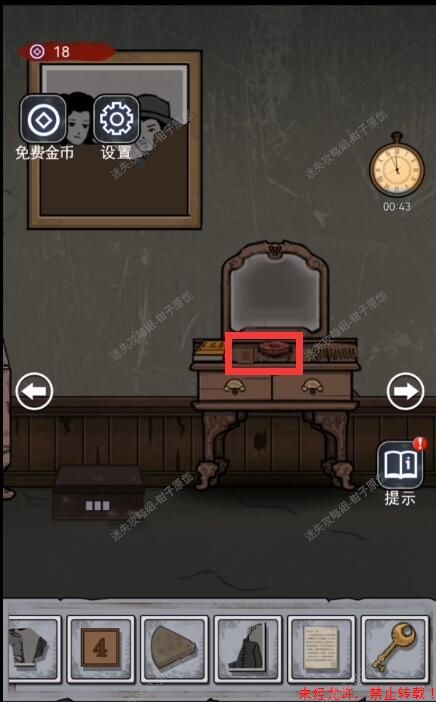 46.左转两次,用钥匙打开梳妆台右边的抽屉,得到数字5。46