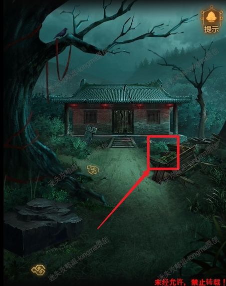53.返回宗祠门口,使用【撬棍】移开大树下的石头,将【按钮】安装在盒子上,对照树上的箭头顺序,打开盒子,获得【木牌】。53 53.1