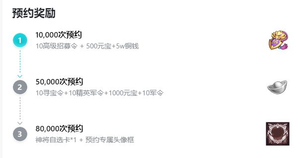 1、预约人数达到1w:高级招募令*10 + 元宝*500+铜钱*50000