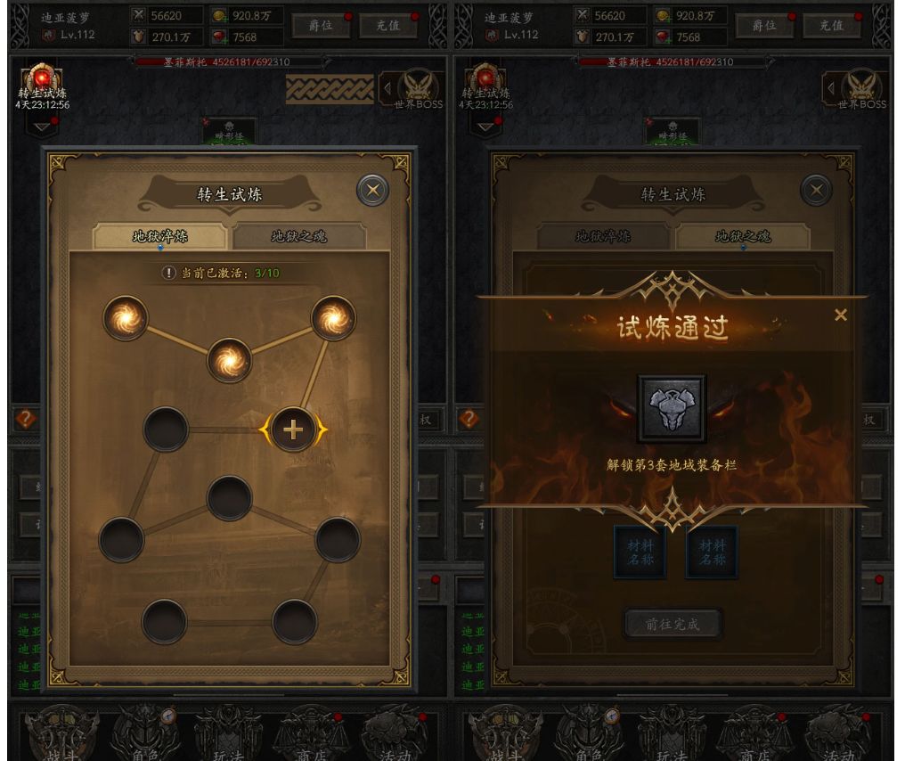 2、转生试炼分为2个阶段,分别为“地狱淬炼”和“地狱之魂”。