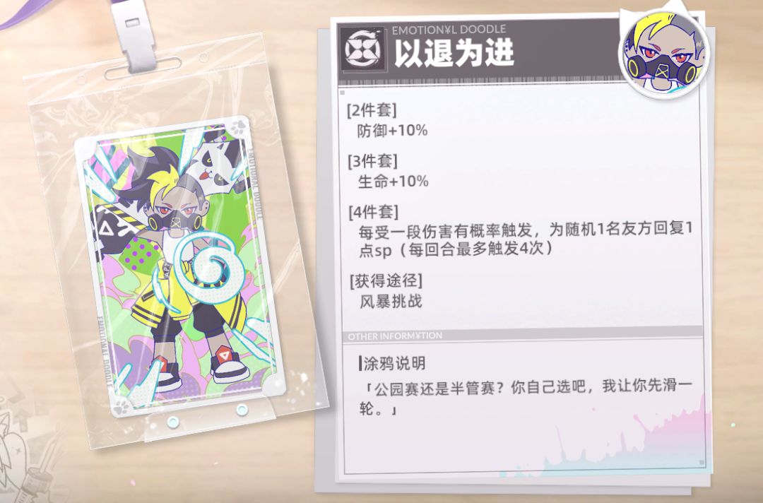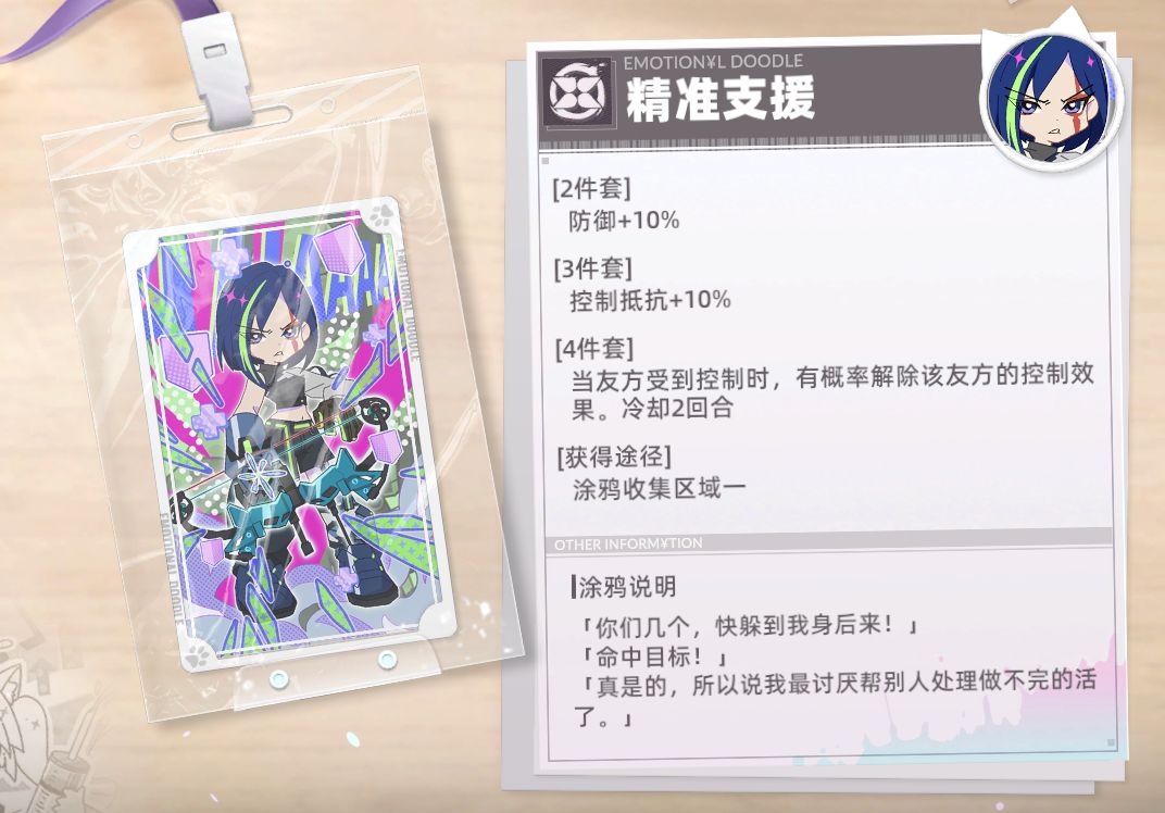 涂鸦讲解:非常适合间伤角色,因为间伤角色独特的锁面板机制可以享受首回合巨额攻击力加成。且SP回复速度加快。