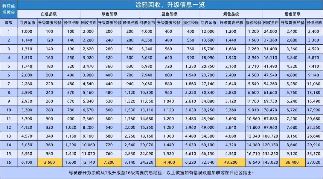 涂鸦升级及回收的具体数值如下