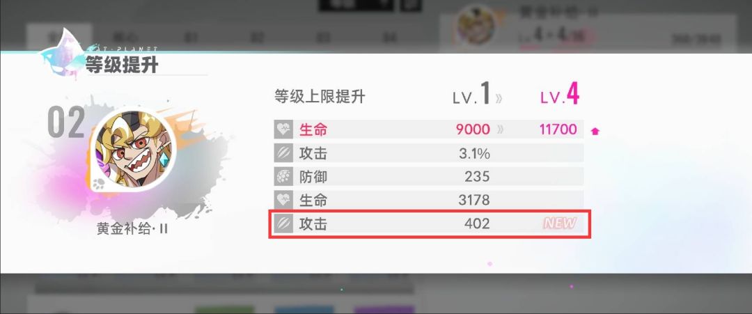 效果介绍:使用增益技能后,按自身7.5%/6%/5%/3%/3%提升友方全体攻击力,可叠加3层。