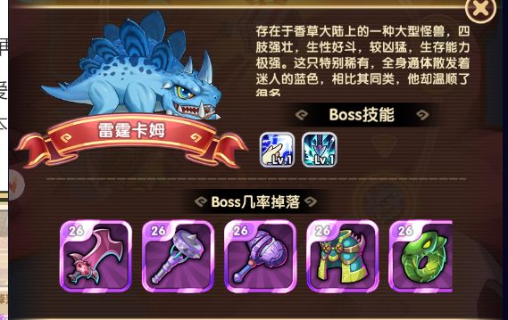 不得不说游戏内的BOSS画风还是很可爱的,并且点开每一个BOSS还有背景介绍和技能介绍。根据介绍我猜测原型是魔兽世界中的斯卡姆,在魔兽中它也是位于哀嚎洞穴的,击败即可获得雷霆蜥蜴部件等。