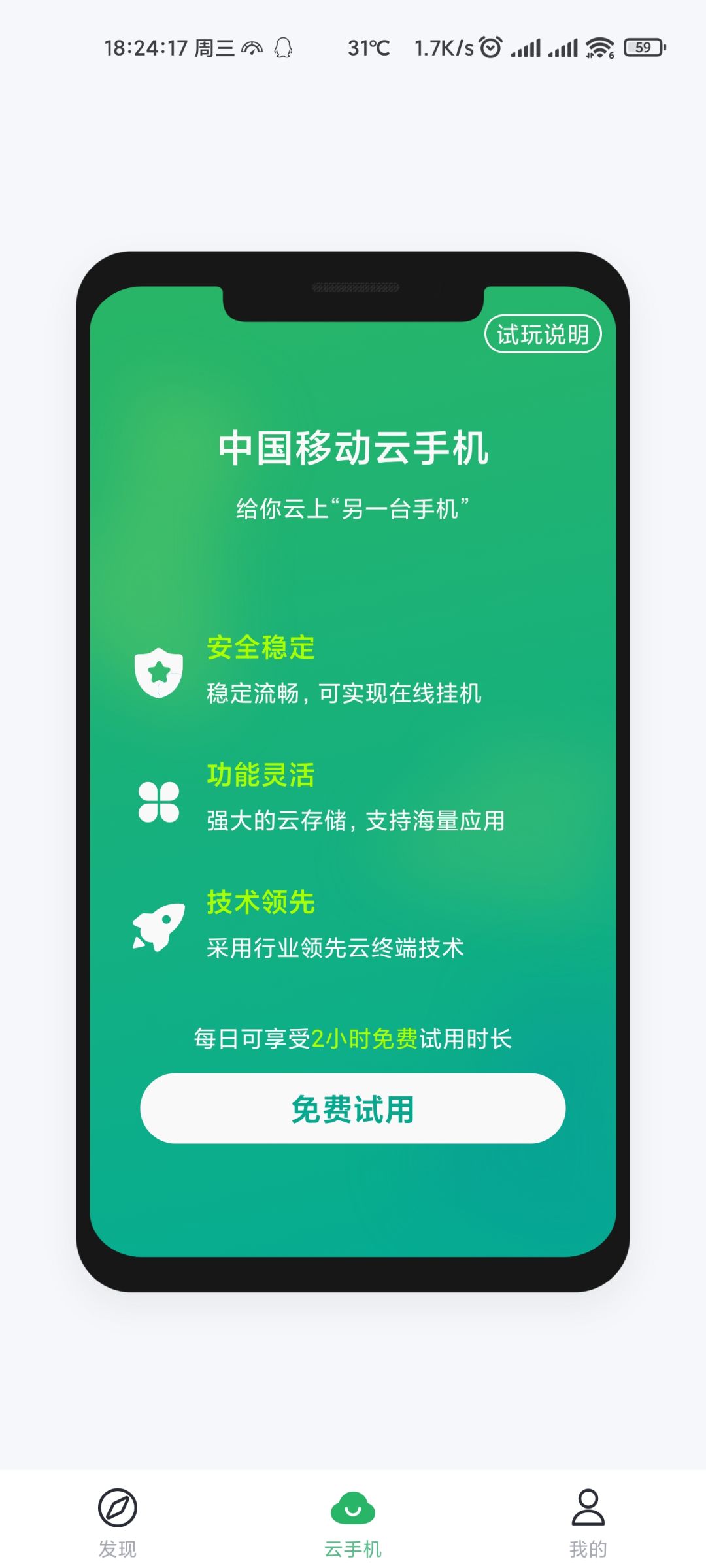偶然发现有一个籍籍无名的云手机-移动云手机,没错就是中国移动出的一款云手机,每天可以白嫖2小时。