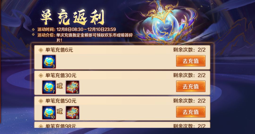 SP暗器首发充值,单充即可获得SP绝世暗器碎片3选1、SSS暗器碎片7选1、欢乐币等资源,助力魂师大人们快速养成新暗器!欢乐币可在“幸运秘宝”活动中抽取暗器相关资源!