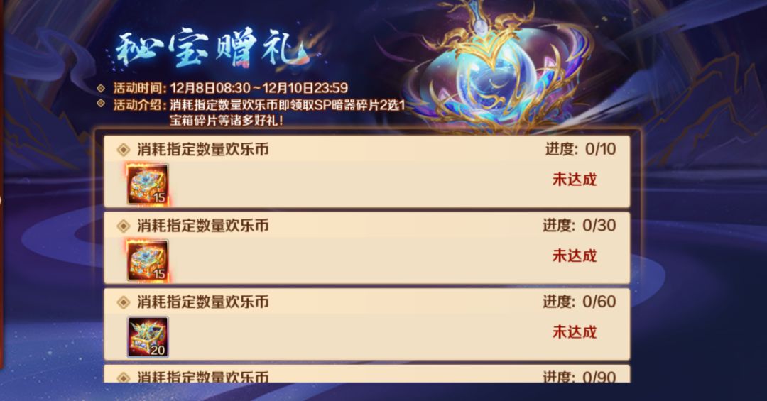 累计消耗指定数量欢乐币可在“秘宝赠礼”活动中获赠SP绝世暗器碎片3选1、SSS暗器碎片等珍贵资源!