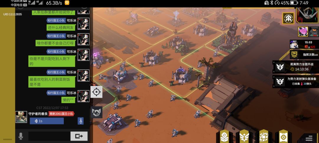 给大家避个雷 😔碰到这个人 大家注意一点 和自己小号双排 开局当四合院战神 晚上11点多才开出来 嗯不知道为啥 和自己邻居闹别扭了 互相打架 二打一成功把邻居打跑了 随后阴阳怪气 开局分配完之后 对面国王是我们的邻居 (本来是要来我们这里的但是没有人打就随机分配了) 她想要拿上面的神罚直接冲过来 把我的分基地打了 随后说借个路 然后不出意外的被我打下线了 本来和对面国王讲好了的明天推双塔早点结束 结果她一上来就建了一堆防御还升了三级神罚 打架 打又打不过 说话 讲不过还理亏 就只能以一人之力ex全局的玩家了 (绝对没有私信辱骂 也没有在她和邻居打架的时候带节奏😪)