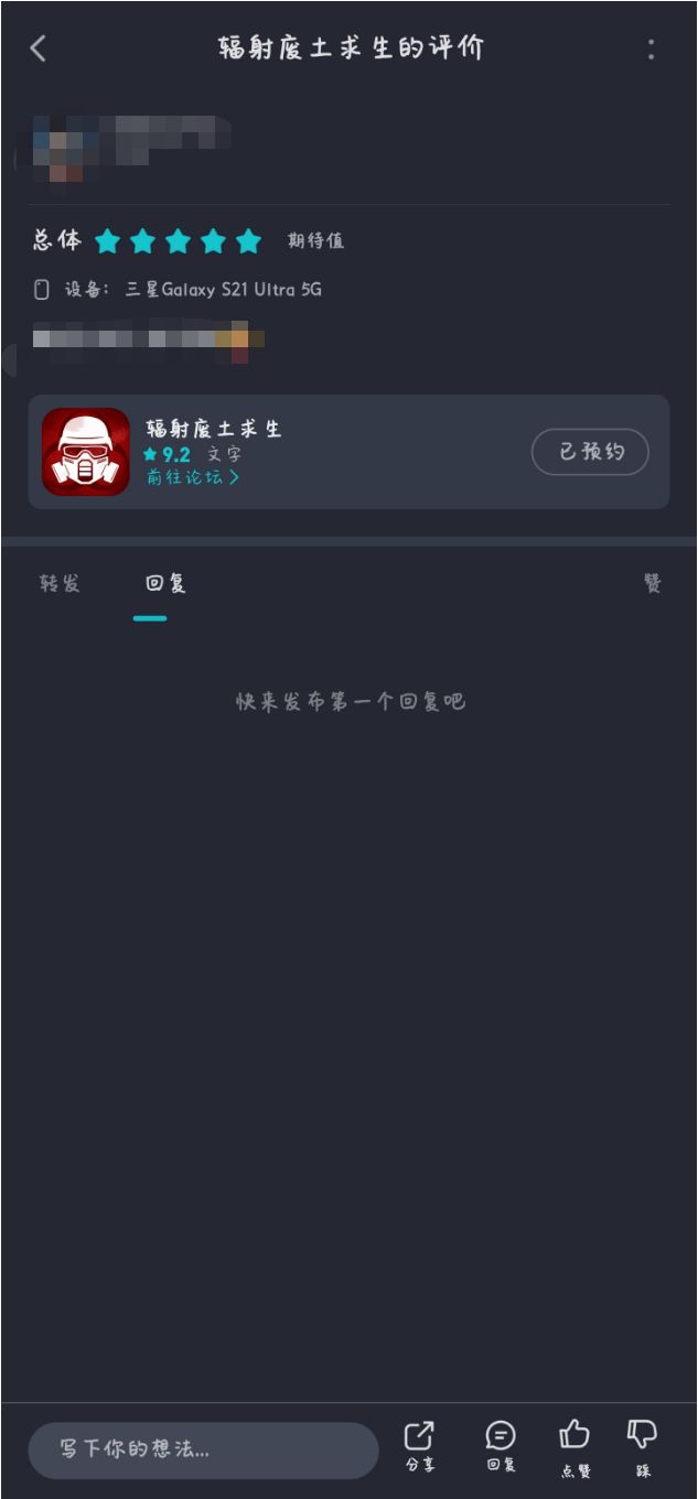 预约并打分评价《辐射废土求生》,并在该帖内发送评价区评论后截图,如下图