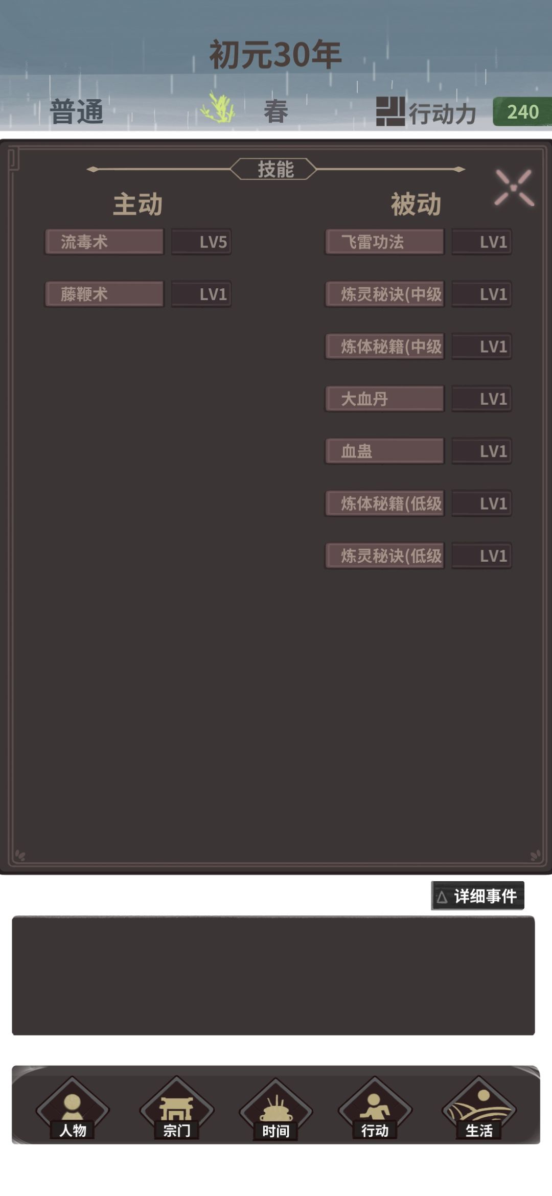 在41岁蝗灾到来前,把技能都买全学全(流毒前面转毒属性以后就得买,其他四个炼灵练体被动看心情买)