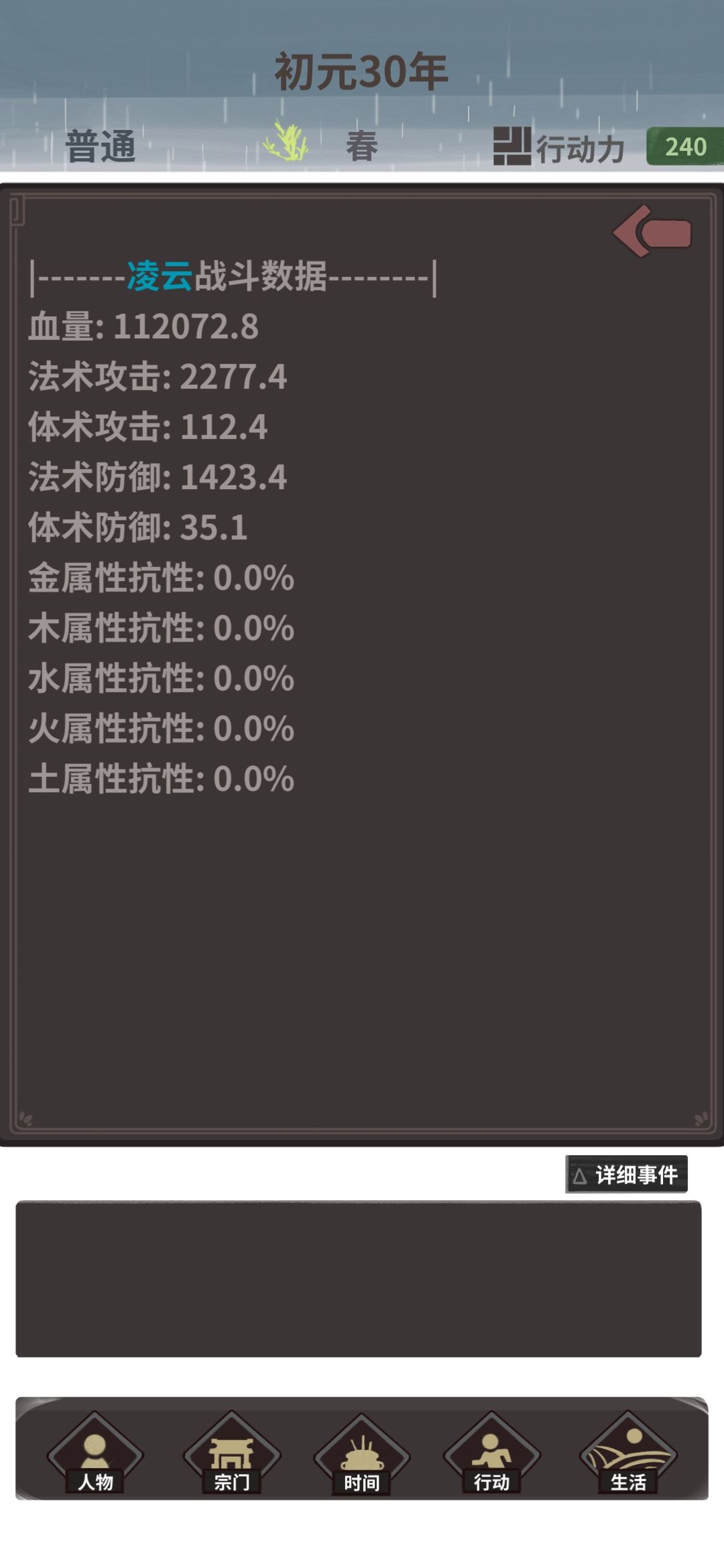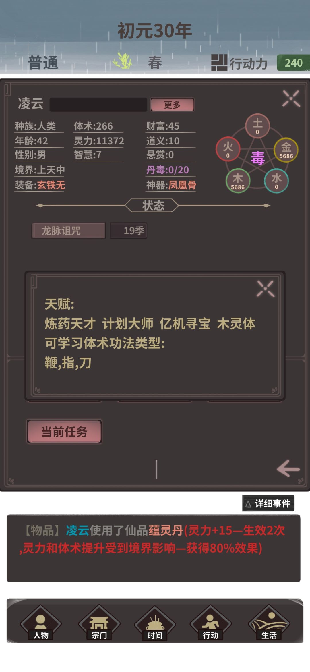 然后就是在桃花源玩命的sl采药,炼药吃药,精打细算利用每10点体力,只要耐心足够,完全可以在40岁的时候拿到1w灵的属性。面板如图
