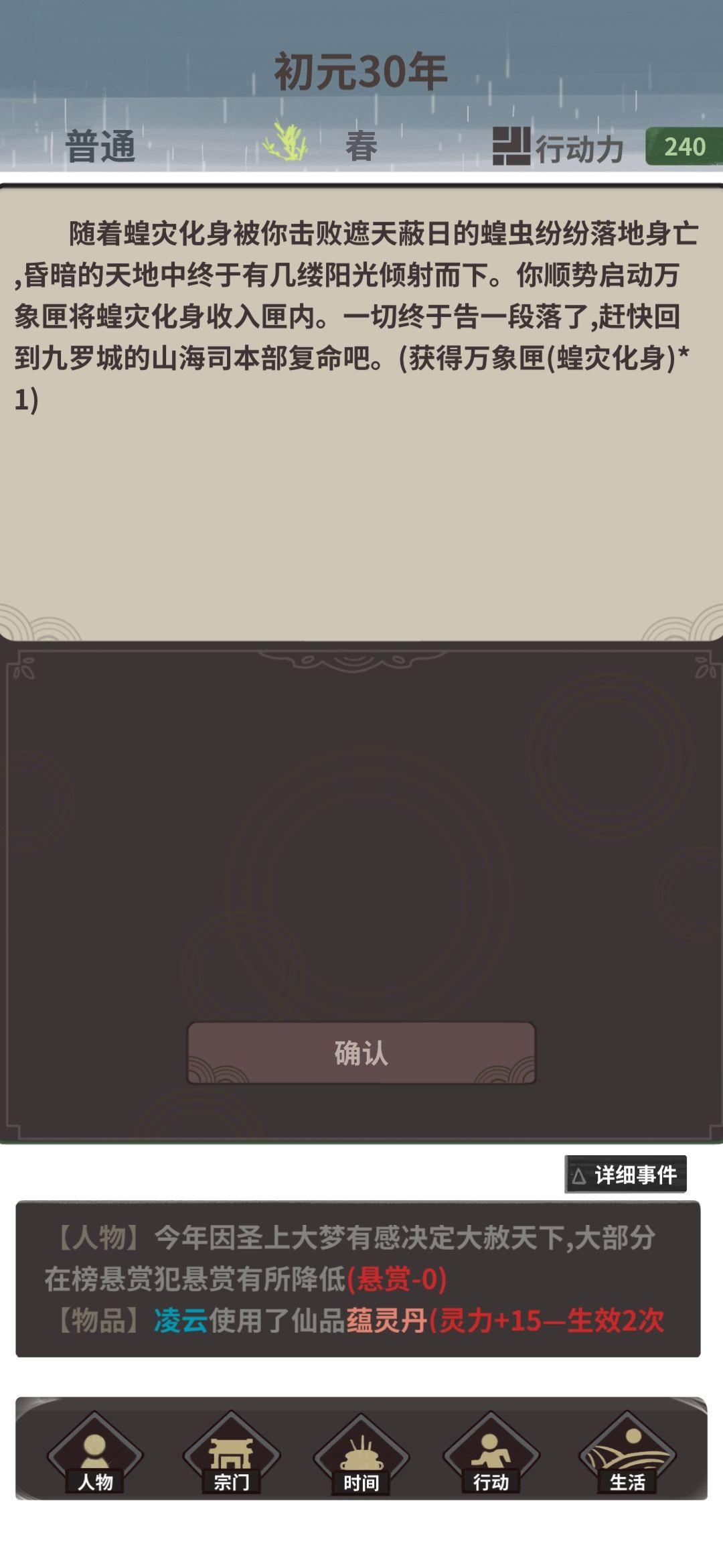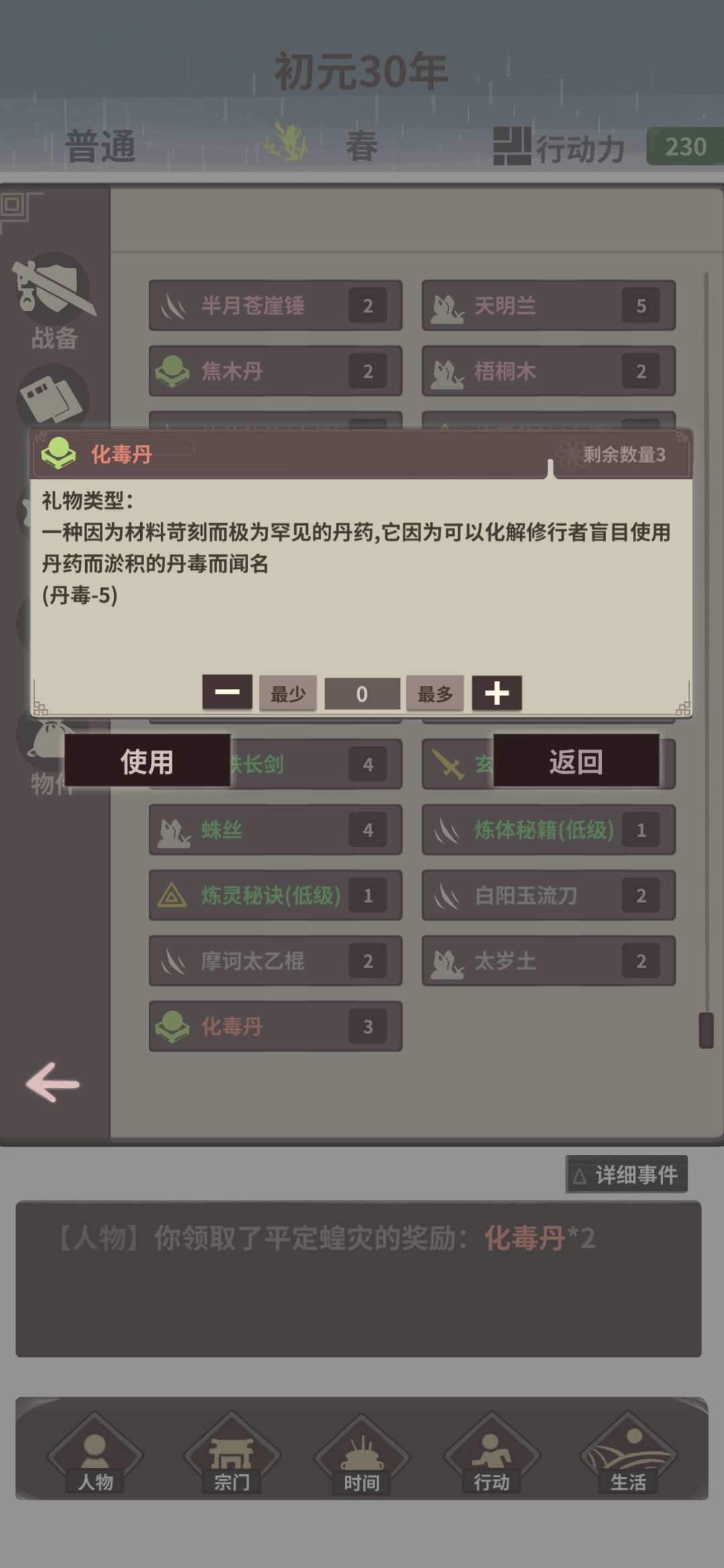然后剩下的时间,在桃花源采万年铁木木四金一,两个铁木可得到一个仙品纳灵+25灵,sl采药,炼药,吃药,一直到五阶;