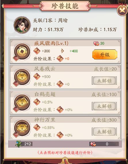 周瑜的珍兽是丹朱鹤,他是没有那种特殊技能的珍兽,技能就是下放的属性。一共是4个技能都是增加赚速的没有特殊触发效果。