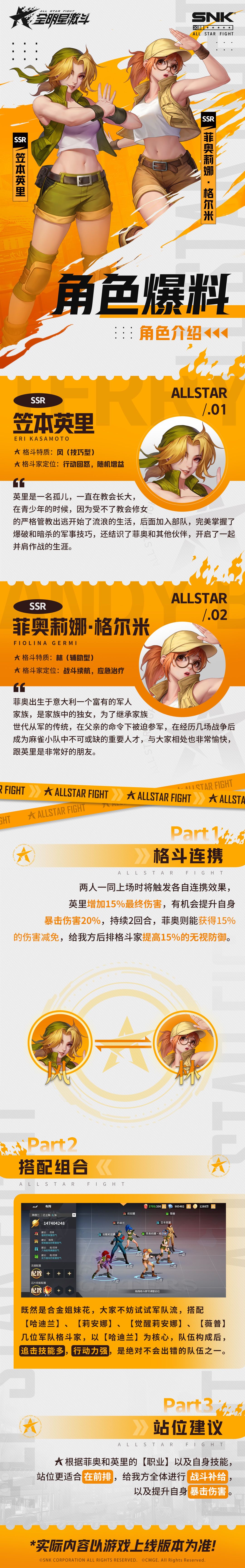 各位经纪人们好呀,继上次超凡SSR格斗家上线后,我们又将迎来两位全新SSR格斗家,她们都来自正规军情报部特殊部队,严苛的训练和完美的配合,让两人在军队也建立了深厚的友谊,经纪人将在全新版本“异界行动·合金”中与她们相遇,让我们一起来看看这两位新角色资料吧!