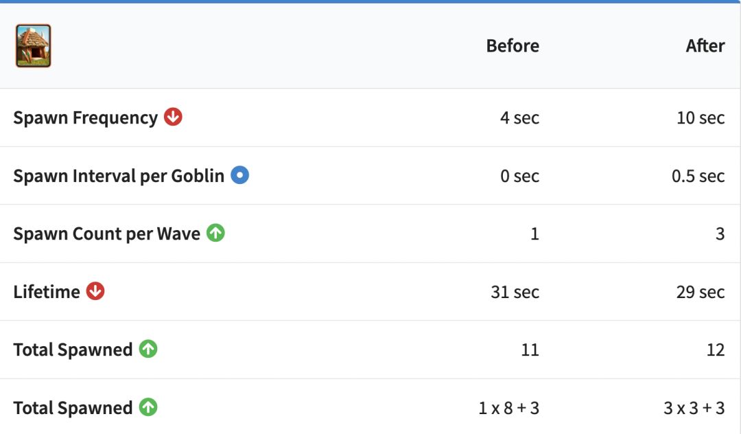 跟上次野蛮人小屋的重做差不多,调整后的哥布林小屋每一波会生成更多的单位,但是间隔变长。