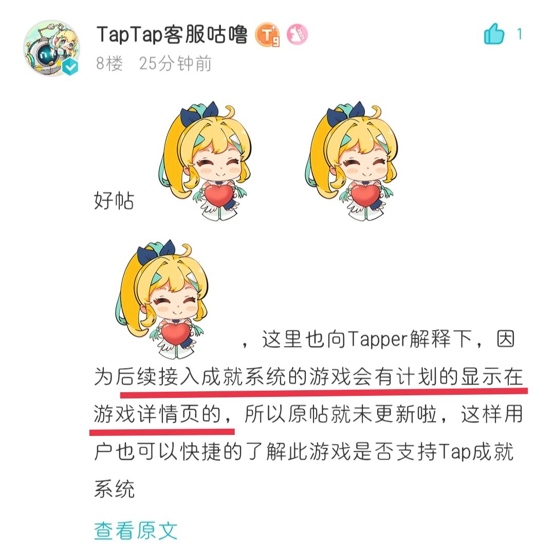 首当其冲的现带来一个好消息,此帖的发布也收到了官方的回应,非常的开心,我们在这里知道了了解一个游戏是否有成就系统的便捷也会在后续上线,在这里为TapTap点赞![[嗒啦啦4_不愧是你]](https://img.tapimg.com/market/images/a9080a7d42b1d9baf3fa892c54bf3381.gif)