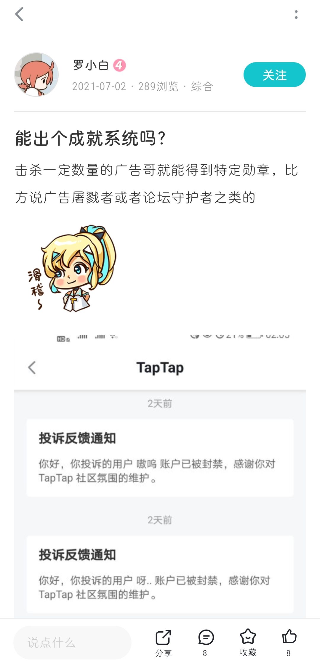 这位玩家的意见贴,不得不说给我很大启示,底下这位评论的老哥也是(要是大家觉得这样子发出他人的头像和昵称不好的话,后期改了再重新弄)比如TapTap可以根据年终数据总结,来给玩家平时弄个成就,比如点赞,发帖,发视频,转发,评论,论坛等级等等来给玩家制作软件自身的成就,就像勋章可以在发帖的时候会在头像旁边显示一样,成就呢则可以用头像框来显示,亦或者在帖子装饰框,评论框有些许,不那么花里胡哨的小装扮显示,也以此来激励玩家,是得软件使用感大大提升,获得更多的用户好评