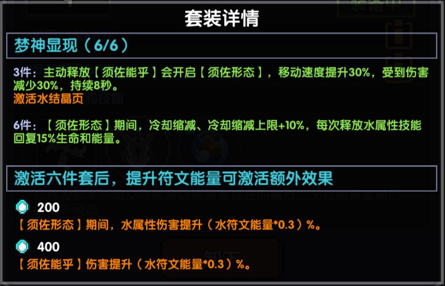 6件:【须佐形态】期间,冷却缩减、冷却缩减上限+10%,每次释放水属性技能回复15%生命和能量。