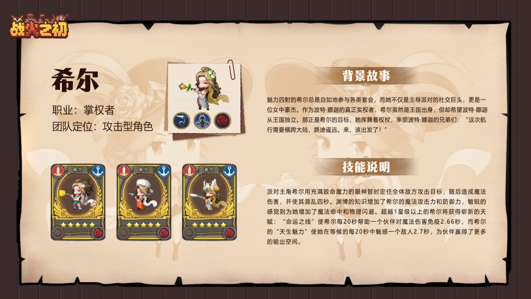 派对主角希尔用充满致命魔力的眼神暂时定住全体敌方攻击目标,随后造成魔法伤害,并使其混乱四秒。渊博的知识增加了希尔的魔法攻击力和防御力,敏锐的感觉则为她增加了魔法命中和物理闪避。超越1星级以上的希尔将获得崭新的天赋:“命运之线”使希尔每20秒帮助一个伙伴对魔法伤害免疫2.66秒,而希尔的“天生魅力”使她在等候的每20秒中魅惑一个敌人2.7秒,为伙伴赢得了更多的输出空间。